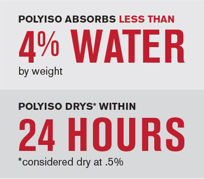 When rewet, the polyiso specimens showed no appreciable increase in water absorption – and no significant changes in drying time. Polyiso sorption behaviors and dry times remained constant because the structure of polyiso is unaltered by wetting and rewetting.