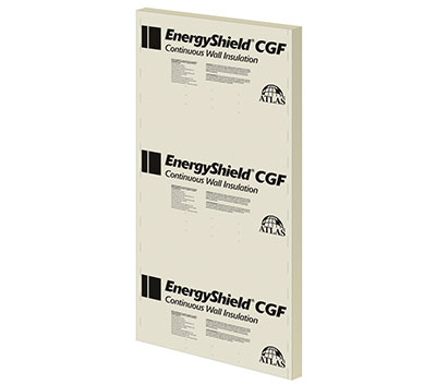Atlas EnergyShield CGF (formerly Rboard®) is composed of a closed cell polyisocyanurate (polyiso) foam core, faced with a non-reflective coated glass-mat facer on both sides. The blowing agent used to produce the polyiso foam core does not contain any CFCs, HCFCs or HFCs. EnergyShield CGF has zero Ozone Depletion Potential (ODP) and negligible Global Warming Potential (GWP). Atlas EnergyShield CGF combines high R-value, enhanced durability from two coated glass-mat facers, and water resistive attributes in a high performance rigid Wall insulation. EnergyShield CGF is suitable for a variety of continuous insulation (CI) applications.